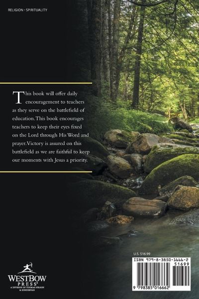 This book will offer daily encouragement to teachers as they serve on the battlefield of education. This book encourages teachers to keep their eyes fixed on the Lord through His Word and prayer. Victory is assured on this battlefield as we are faithful to keep our moments with Jesus a priority.