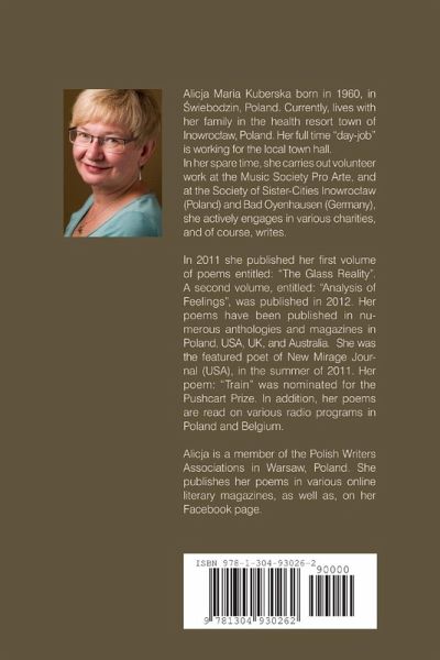 Alicja Kuberska is a Polish poet with a rare gift. Not only does she write poetry that has deep emotional resonance, her poetry reads beautifully in translation. Her poems are sometimes sad and sometimes whimsical, but they always leave an abiding impression on the reader who connects with her words which glimpse into a moment, or a thought we ourselves have known: we have all felt those emotions she writes of so eloquently. Alicja poems freeze moments in time, to be read, and reread and savoured. Marie-Ora de Villiers
