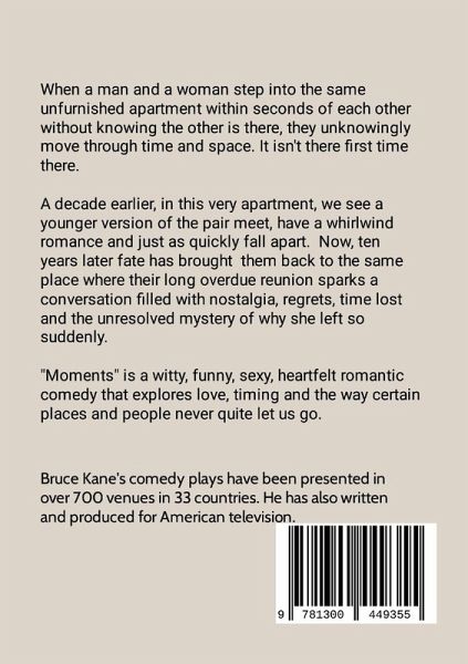 When a man and a woman, both in their late thirties, step into the same unfurnished apartment within seconds of each other, they unknowingly move through the space without crossing paths. But this isn't their first time here. A decade earlier, in this very apartment, a younger version of the pair met, fell into a whirlwind romance, and then just as quickly fell apart-when she vanished without a word. Now, ten years later, fate has led them back to the same four walls, where their long-overdue reunion sparks a conversation filled with nostalgia, regrets, and the unresolved mystery of why she left. As they piece together their past, the pull between them proves undeniable. Just when it seems they'll walk away again, history teases a second chance. Will they take it? A witty and heartfelt one-act romantic comedy, Moments explores love, timing, and the way certain places-and people-never quite let us go.