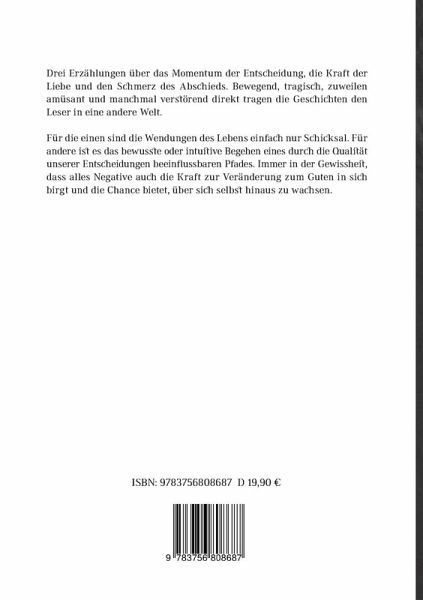 Drei Erzählungen über das Momentum der Entscheidung, die Kraft der Liebe und den Schmerz des Abschieds. Bewegend, tragisch, zuweilen amüsant und manchmal verstörend direkt tragen die Geschichten den Leser in eine andere Welt.Für die einen sind die Wendungen des Lebens einfach nur Schicksal. Für andere ist es das bewusste oder intuitive Begehen eines durch die Qualität unserer Entscheidungen beeinflussbaren Pfades. Immer in der Gewissheit, dass alles Negative auch die Kraft zur Veränderung zum Guten in sich birgt und die Chance bietet, über sich selbst hinaus zu wachsen.