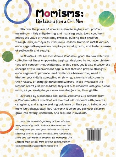 Discover the power of Momisms-simple sayings with profound meanings-in this enlightening and inspiring book. Every cool mom knows the value of these pithy phrases, guiding their children through life's journey with invaluable lessons. Momisms instill virtues, encourage self-expression, inspire personal growth, and foster a sense of self-worth and beauty. In Momisms: Life Lessons from a Cool Mom, you'll find an extensive collection of these empowering sayings, designed to help our children face and conquer life's challenges. In this book, you'll also discover the concept of the Impowerment app-a tool that can provide strength, encouragement, patience, and resilience whenever they need it. Whether your child is struggling or striving, a Momism will come to their rescue, offering guidance and support. These invaluable life lessons aren't just for children; they will also resonate with you, a cool mom, as you navigate your own amazing journey through life. Authored by a seasoned cool mom, Momisms: Life Lessons from a Cool Mom offers practical wisdom that will resonate with parents, caregivers, and anyone seeking guidance on their path. Being a cool mom isn't always easy, but it's worth it when you see your children grow into strong, confident, and resilient individuals. Join this incredible journey of love, wisdom, and personal growth. Embrace the Momisms that will empower you and your children to create a fabulous life full of joy, purpose, and fulfillment. From one cool mom to another, let Momisms: Life Lessons from a Cool Mom be your companion on this remarkable adventure called life.