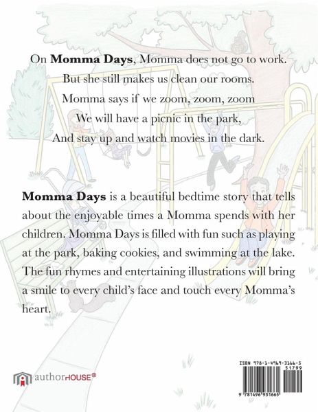 On Momma Days, Momma does not go to work. But she still makes us clean our rooms. Momma says if we zoom, zoom, zoom We will have a picnic in the park, And stay up and watch movies in the dark. Momma Days is a beautiful bedtime story that tells about the enjoyable times a Momma spends with her children. Momma Days is filled with fun such as playing at the park, baking cookies, and swimming at the lake. The fun rhymes and entertaining illustrations will bring a smile to every child's face and touch every Momma's heart.