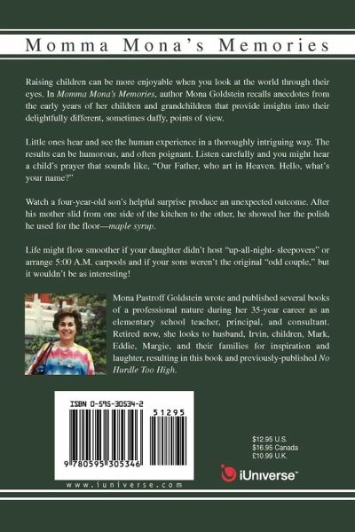 Raising children can be more enjoyable when you look at the world through their eyes. In Momma Mona's Memories, author Mona Goldstein recalls anecdotes from the early years of her children and grandchildren that provide insights into their delightfully different, sometimes daffy, points of view. Little ones hear and see the human experience in a thoroughly intriguing way. The results can be humorous, and often poignant. Listen carefully and you might hear a child's prayer that sounds like, "Our Father, who art in Heaven. Hello, what's your name?" Watch a four-year-old son's helpful surprise produce an unexpected outcome. After his mother slid from one side of the kitchen to the other, he showed her the polish he used for the floor--maple syrup. Life might flow smoother if your daughter didn't host "up-all-night- sleepovers" or arrange 5:00 A.M. carpools and if your sons weren't the original "odd couple," but it wouldn't be as interesting!