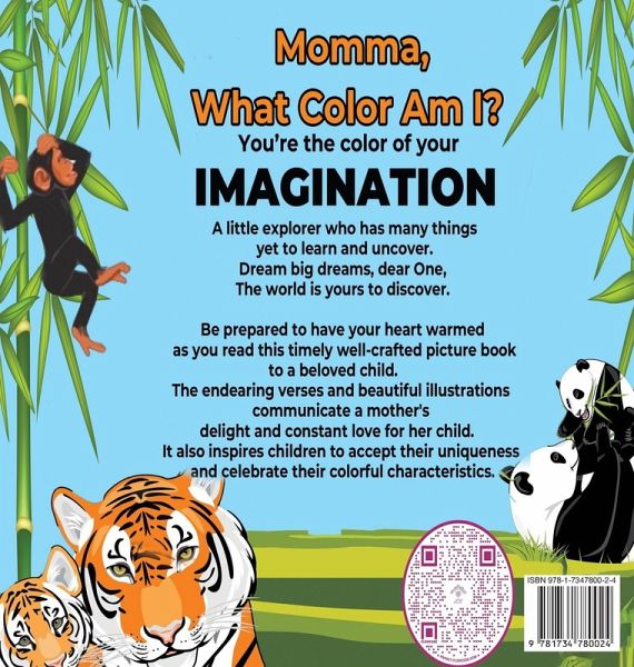 "Momma, what color am I?" "You're the color of your IMAGINATION!" "A little explorer who has many things yet to uncover." "Dream big dreams, dear One!" "The world is yours to discover!" Be prepared to have your heart warmed as your read this timely well-crafted picture book to a beloved child. The endearing verses and beautiful illustrations of its animal characters communicate a mother's delight and constant love for her child. Each page inspires children to accept their uniqueness and celebrate their colorful characteristics.