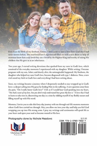 Ever since the birth of my firstborn, Emma, I have come to taste a love from God that I had never known before. This newfound love I experienced filled me with a new desire to help all mommas know how truly loved they are loved by the Highest King and worthy of raising His children that He gave us as an inheritance. Two years ago, I started writing devotions that sparked from my taste in God's love, which consisted of the everyday moments I experienced with my daughter. While writing, I became pregnant with my son, Asher; and shortly after, the unimaginable happened. My firstborn, the daughter who helped me taste God's love, became diagnosed with type 1 diabetes. Now, a new trial tested my faith in God's love and everything I had been writing about. Soon, my writings became a journey where I desperately needed to stay wrapped up in God's love - a deeper calling into His grace by finding Him in the suffering. A new question arose from the pain, Do I really know God's love? I felt as if I could hear God speaking into my heart, You had a taste of my love, but you don't truly understand how great My love is. A love that I had to learn to take root in, discovering one day at a time by ridding myself of my fleshly nature and filling myself up with His word. Momma, I invite you to take this forty-day journey with me through real-life momma moments where God's love carried me through. May you allow me into your day and help you feel God wrapping you up into His strong arms. I pray my writings and testimonies will speak life to your heart and open your soul to become rooted in His love.