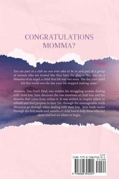 Congratulations Momma? You are part of a club no one ever asks to be in and part of a group of women who are treated like they have the plague. Yes, you are a Momma of an angel, a child that left way too soon. The day your child left this world was the day your life stopped making sense. Momma, You Don't Heal, was written for struggling women dealing with child loss. June discusses the raw emotions of child loss and the demons that come from within it. It was written to inspire others to rebuild and find purpose in their life; through the unimaginable truth Mommas go through when dealing with their loss. June leads moms through the first weeks and months of child loss to help those who feel alone and lost on where to begin.
