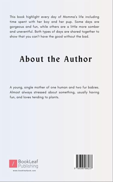 This book highlight the every days of Momma's life including time spent with her boy and her pup. Some days are gorgeous and fun, while others are a little more somber and uneventful. Both types of days are shared together to show that you can't have the good without the bad.