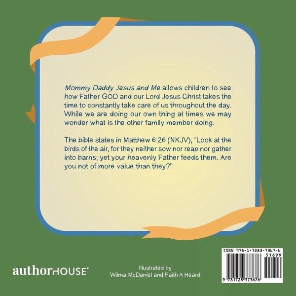 Mommy Daddy Jesus and Me allows children to see how Father GOD and our Lord Jesus Christ takes the time to constantly take care of us throughout the day. While we are doing our own thing at times we may wonder what is the other family member doing. The bible states in Matthew 6:26 (NKJV), "Look at the birds of the air, for they neither sow nor reap nor gather into barns; yet your heavenly Father feeds them. Are you not of more value than they?"