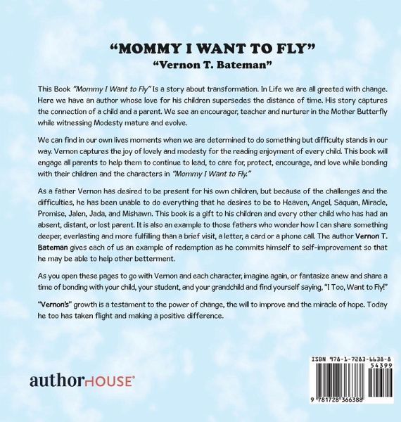 "MOMMY I WANT TO FLY" "Vernon T. Bateman" This Book" Mommy I Want to Fly" Is a story about transformation. In Life we are all greeted with change. Here we have an author whose love for his children supersedes the distance of time. His story captures the connection of a child and a parent. We see an encourager, teacher and nurturer in the Mother Butterfly while witnessing Modesty mature and evolve. We can find in our own lives moments when we are determined to do something but difficulty stands in our way. Vernon captures the joy of lovely and modesty for the reading enjoyment of every child. This book will engage all parents to help them to continue to lead, to care for, protect, encourage, and love while bonding with their children and the characters in "Mommy I Want to Fly." As a father Vernon has desired to be present for his own children, but because of the challenges and the difficulties, he has been unable to do everything that he desires to be to Heaven, Angel, Saquan, Miracle, Promise, Jalen, Jada, and Mishawn. This book is a gift to his children and every other child who has had an absent, distant, or lost parent. It is also an example to those fathers who wonder how I can share something deeper, everlasting and more fulfilling than a brief visit, a letter, a card or a phone call. The author Vernon T. Bateman gives each of us an example of redemption as he commits himself to self-improvement so that he may be able to help other betterment. As you open these pages to go with Vernon and each character, imagine again, or fantasize anew and share a time of bonding with your child, your student, and your grandchild and find yourself saying, "I Too, Want to Fly!" "Vernon's" growth is a testament to the power of change, the will to improve and the miracle of hope. Today he too has taken flight and making a positive difference.