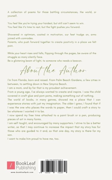 ""A collection of poems for those battling circumstances, the world, or yourself. You feel like you're trying your hardest, but still can't seem to win. You feel like it's time to rest, but the fight pushes you forward. Showered in optimism, coated in motivation, our feet trudge on, arms joined with comrades. Parents, who push forward together to create positivity in a place we felt pain. While your heart rises and falls, flipping through the pages, be aware of the struggle so many silently face. Be a glistening beam of light, to someone who needs a beacon.""