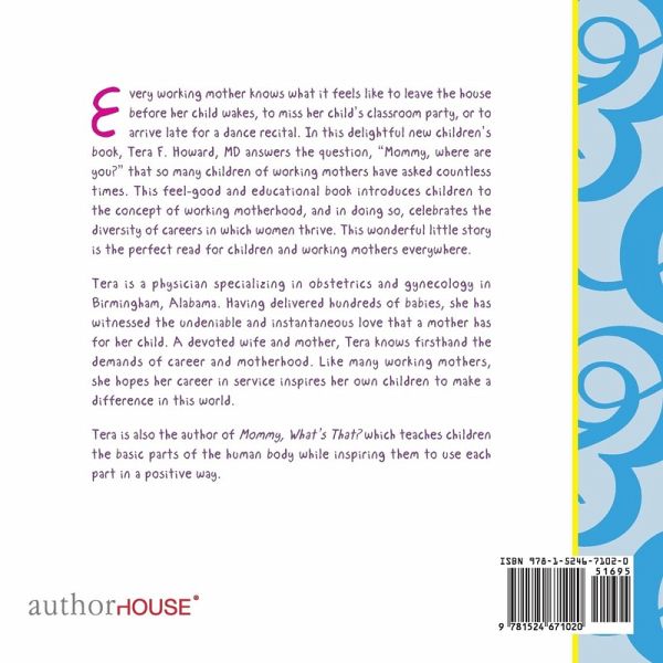 Every working mother knows what it feels like to leave the house before her child wakes, to miss her child's classroom party, or to arrive late for a dance recital. In this delightful new children's book, Tera F. Howard, MD answers the question, "Mommy, where are you?" that so many children of working mothers have asked countless times. This feel-good and educational book introduces children to the concept of working motherhood, and in doing so, celebrates the diversity of careers in which women thrive. This wonderful little story is the perfect read for children and working mothers everywhere. Tera is a physician specializing in obstetrics and gynecology in Birmingham, Alabama. Having delivered hundreds of babies, she has witnessed the undeniable and instantaneous love that a mother has for her child. A devoted wife and mother, Tera knows firsthand the demands of career and motherhood. Like many working mothers, she hopes her career in service inspires her own children to make a difference in this world. Tera is also the author of Mommy, What's That? which teaches children the basic parts of the human body while inspiring them to use each part in a positive way.
