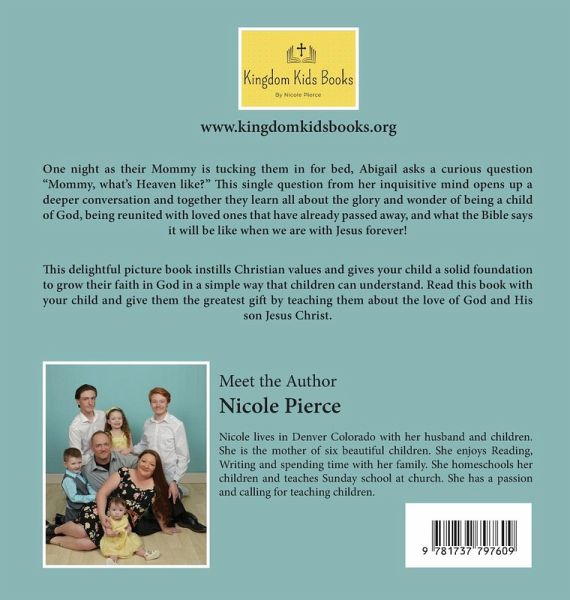 Join young Abigail and Daniel as they learn from their mommy what the Bible says about Heaven and God's promise of salvation. One night as their Mommy is tucking them in for bed, Abigail asks a curious question "Mommy, what's Heaven like?" This single question from her inquisitive mind opens up a deeper conversation and together they learn all about the glory and wonder of being a child of God, being reunited with loved ones that have already passed away, and what the Bible says it will be like when we are with Jesus forever! This delightful picture book instills Christian values and gives your child a solid foundation to grow their faith in God in a simple way that children can understand. Read this book with your child and give them the greatest gift by teaching them about the love of God and His son Jesus Christ.