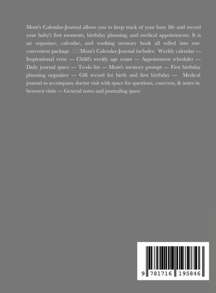Mom's Calendar-Journal allows you to keep track of your busy life and record your baby's first moments, birthday planning, and medical appointments. It is an organizer, calendar, and working memory book all rolled into one convenient package. Mom's Calendar-Journal includes: Weekly calendar --- Inspirational verse --- Child's weekly age count --- Appointment scheduler --- Daily journal space --- To-do list --- Mom's memory prompt -- First birthday planning organizer --- Gift record for birth and first birthday --- Medical journal to accompany doctor visit with space for questions, concerns, & notes in between visits --- General notes and journaling space
