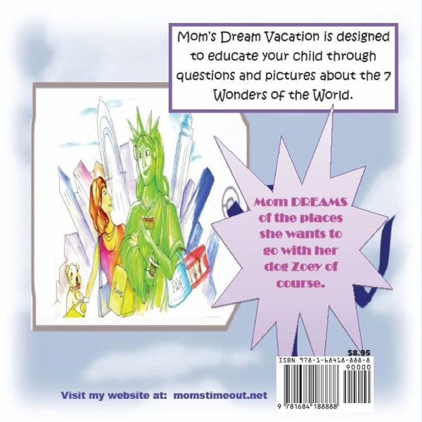 Mom's Dream Vacation is designed to educate your child through questions and pictures about the 7 Wonders of the World. Mom DREAMS of the places she wants to go with her dog Zoey of course. the book also has questions on how we can help Mom and being kind. From beginning to end a joy, funny and beautiful illustrations.