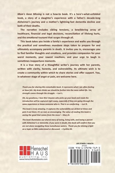 Mom’s Gone Missing is not a how-to book. It’s a here’s-what-unfolded book, a story of a daughter’s experience with a father’s decade-long Alzheimer’s journey and a mother’s lightning fast dementia decline and both of their deaths. The narrative includes sibling tensions, a bewildering array of healthcare, financial and legal decisions, reconciliation of lifelong hurts, and the emotional tsunami that surges through all. This book takes you inside a family’s experience and walks you through the practical and sometimes mundane steps taken to prepare for and ultimately accompany parents in death. It invites you in, encourages you to find familiar thoughts and emotions, and provides compassion for your worst moments, your rawest reactions, and your urge to laugh in sometimes inopportune moments. It is a true story of a thoughtful writer’s journey with her parents, written with clarity, honesty, and vulnerability. Its ultimate wish is to create a community within which to share stories and offer support. You, in whatever stage of angst or pain, are welcome here.