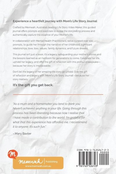 Looking for a gift for your Mom which she will never forget? Introducing "Mom's Life Story". Crafted by Memwah, Australia's leading Life Story Video Maker, this guided journal offers prompts and exercises to evoke the storytelling process and authentically capture the essence of your mother's life. It's the most thoughtful and important gift that you can give! This guided journal serves as an open invitation for your mother to document her journey through life, chronicling her experiences, challenges, joys, and lessons learned along the way. Once her stories are written down, this journal transforms into a memorable family heirloom-a collection of personal anecdotes and wisdom to be cherished and passed down through the generations. Ideal for any occasion, whether it be Mother's Day, birthdays, or just because, this journal is the ultimate gift you can give to your Mom. Why "Mum's Life Story" Stands Out: Collaboration with Experts: Developed in collaboration with mental health practitioners, this journal is structured to encourage reflective thinking and emotional well-being through storytelling. Over 100 Thoughtful Prompts: Featuring more than 100 carefully designed question prompts and exercises, "Mom's Life Story" guides your mother gently down memory lane. From her early years, cherished family traditions, and pivotal moments to personal reflections and dreams for the future, every aspect of her life is explored. Embraces Authenticity Over Perfection: Unlike journals with polished gilded pages, "Mom's Life Story" values the genuine and unpolished reflections of your mother's life. It's designed to capture the essence of her experiences-messy, raw, and real-emphasizing that the true beauty of the journal lies in its authenticity and the unique story it tells. The Gift of a Lifetime: Gifting this journal to your mother is an act of love that goes beyond the ordinary. It's an opportunity for her to reflect on her life's journey, acknowledge her accomplishments, and share invaluable lessons. A Legacy for Generations: "Mom's Life Story" becomes a cherished heirloom, a way for future generations to connect with their heritage, understand their roots, and draw inspiration from the matriarch's life stories and philosophies. Perfect Size: 6 x 9 inches Crafted in Australia Why Choose "Mom's Life Story"? Produced by Memwah's Team: Leveraging our experience in capturing life stories through video, we've poured our expertise into creating a journal that's both meaningful and easy to use. Perfect Gift for Any Occasion: Whether it's Mother's Day, a birthday, or just because, gifting this journal shows her how much her story matters to you. Everlasting Gift: Beyond the here and now, this journal serves as a beacon for future generations, enlightening them with a well-lived life's joys, challenges, and triumphs. Embrace the Journey, Leave a Legacy With "Mom's Life Story," empower your mother to tell her tale, her way. It's an invitation to a walk down memory lane, an exploration of life's greatest moments, and an ode to the love and wisdom that only a mother can impart. Don't wait -gift this keepsake today and ensure that the stories don't go untold!