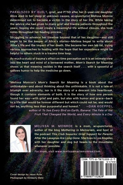 Mom's Search for Meaning was awarded Honorable Mention in Writer's Digest 2023 Self-Published Book Awards. Paralyzed by guilt, grief, and PTSD after her 2-year-old daughter Alice died in her sleep of unknown causes, acupuncturist Melissa Monroe determined not to become a victim in the story of her life. While taking the advice she had given to many grief and trauma patients throughout the years, hoping she could create a meaningful life without closure, she took notes throughout her healing process. Struggling to advance her timeline beyond that of her daughter's - and still eager to be the keeper of Alice's stories - Melissa began to write about Alice's life and the impact of her death. She became her own lab rat, trying various approaches to healing with the hope that her experience might be helpful to others stuck in a trauma time loop. As much a study of trauma's effect on time perception as it is an intimate view into the heart and mind of a bereaved mother, "Mom's Search for Meaning" shows us that meaning resides in the search itself ... with a spoonful of gallows humor to help the medicine go down.