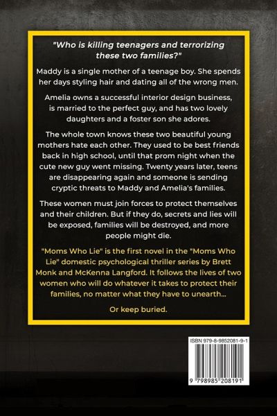Lyla Bailey's summer was devastating. But her junior year of high school is going to be murder. The beautiful teen is physically and emotionally damaged from the car crash that killed her best friend and almost killed her. She's no longer interested in cheerleading, boys, or hanging out with her twin sister and their friends. A creepy new girl at school won't leave her alone. That is, until she goes missing during a school camping trip, and later turns up dead. Lyla and her friends investigate their classmate's death, but a mysterious stalker sends them cryptic messages which lure them into dangerous situations, each more terrifying than the next. To make things worse, Lyla's mom is acting really suspicious... like she's hiding something. Can Lyla and her friends stop the killer, or will they be the next victims? This is the first book in a 5-BOOK SERIES with JAW-DROPPING CLIFFHANGERS. Moms Who Lie is the first gripping novel in the totally addictive 5-book domestic psychological thriller series by Brett Monk and McKenna Langford.