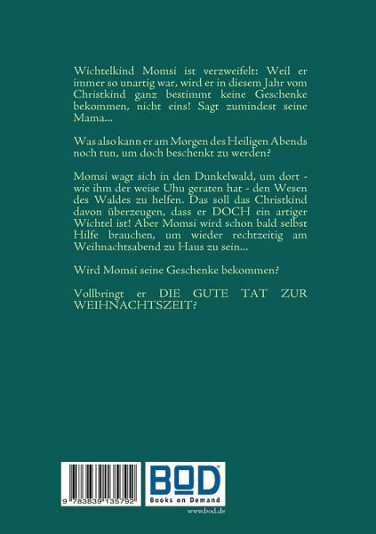 Wichtelkind Momsi ist verzweifelt: Weil er immer so unartig war, wird er in diesem Jahr vom Christkind ganz bestimmt keine Geschenke bekommen, nicht eins! Sagt zumindest seine Mama...Was also kann er am Morgen des Heiligen Abends noch tun, um doch beschenkt zu werden?Momsi wagt sich in den Dunkelwald, um dort - wie ihm der weise Uhu geraten hat - den Wesen des Waldes zu helfen. Das soll das Christkind davon überzeugen, dass er DOCH ein artiger Wichtel ist! Aber Momsi wird schon bald selbst Hilfe brauchen, um wieder rechtzeitig am Weihnachtsabend zu Haus zu sein...Wird Momsi seine Geschenke bekommen?Vollbringt er DIE GUTE TAT ZUR WEIHNACHTSZEIT?