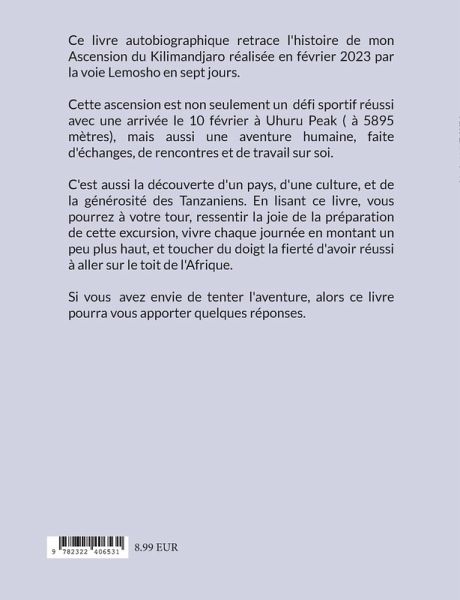 Ce livre autobiographique retrace l'histoire de mon Ascension du Kilimandjaro réalisée en février 2023 par la voie Lemosho en sept jours. Cette ascension est non seulement un défi sportif réussi avec une arrivée le 10 février à Uhuru Peak ( à 5895 mètres), mais aussi une aventure humaine, faite d'échanges, de rencontres et de travail sur soi. C'est aussi la découverte d'un pays, d'une culture, et de la générosité des Tanzaniens. En lisant ce livre, vous pourrez à votre tour, ressentir la joie de la préparation de cette excursion, vivre chaque journée en montant un peu plus haut, et toucher du doigt la fierté d'avoir réussi à aller sur le toit de l'Afrique. Si vous avez envie de tenter l'aventure, alors ce livre pourra vous apporter quelques réponses.