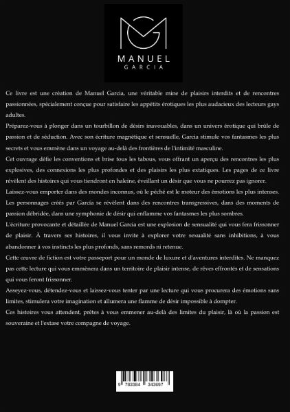 Ce livre est une création de Manuel Garcia, une véritable mine de plaisirs interdits et de rencontres passionnées, spécialement conçue pour satisfaire les appétits érotiques les plus audacieux des lecteurs gays adultes.Prépare-toi à te plonger dans un tourbillon de désirs inavouables, dans un univers érotique qui brûle de passion et de séduction. Avec son écriture magnétique et sensuelle, Garcia stimule tes fantasmes les plus secrets, t'emmenant dans un voyage au-delà des frontières de l'intimité masculine.Cet ouvrage défie les conventions et brise tous les tabous, t'offrant un aperçu des rencontres les plus explosives, des connexions les plus profondes et des plaisirs les plus extatiques. Les pages de ce livre révèlent des histoires qui te tiendront collé aux mots, éveillant un désir que tu ne pourras pas ignorer.Laisse-toi emporter dans des mondes inconnus, où le péché est le moteur des émotions les plus intenses. Les personnages créés par García se révèlent dans des rencontrestransgressives, dans des moments de passion débridée, dans une symphonie de désir qui enflamme tes fantasmes les plus sombres.L'écriture provocante et détaillée de Manuel García est une explosion de sensualité qui te fera frissonner de plaisir. À travers ses histoires, il t'invite à explorer ta sexualité sans inhibitions, à t'abandonner à tes instincts les plus profonds, sans remords ni retenue.Cette oeuvre de fiction est ton passeport pour un monde de luxure et d'aventures interdites. Ne manque pas cette lecture qui t'emmènera dans un territoire de plaisir intense, de rêves effrontés et de sensations qui te feront frissonner.Assieds-toi, détends-toi et laisse-toi aller à une lecture qui te procurera des émotions sans limites, stimulera ton imagination et allumera une flamme de désir qui ne peut être apprivoisée.Ces histoires t'attendent, prêtes à t'emmener au-delà des limites du plaisir, là où la passion est souveraine et où l'extase est ton compagnon de voyage.