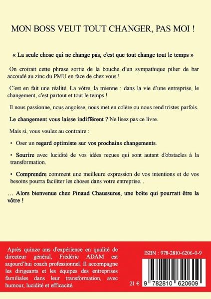 "La seule chose qui ne change pas, c'est que tout change tout le temps"On croirait cette phrase sortie de la bouche d'un sympathique pilier de bar accoudé au zinc PMU en face de chez vous !C'est en fait une réalité. La vôtre, la mienne : dans la vie d'une entreprise, le changement, c'est partout et tout le temps !Il nous passionne, nous angoisse, nous met en colère ou nous rend tristes parfois.Le changement vous laisse indifférent ? ne lisez pas ce livre.Mais, si vous voulez au contraire :- Oser un regard optimiste sur vos prochains changements.- sourire avec lucidité de vos idées reçues qui sont autant d'obstacles à la transformation.- Partager comment une meilleure expression de vos intentions et vos besoins peut demain faciliter les choses dans votre propre entreprise.Alors bienvenue chez Pinaud Chaussures, une boîte qui pourrait être la vôtre !