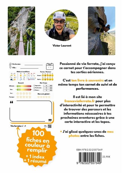 J'ai conçu ce carnet de bord en tant que passionné de via ferrata pour des via-ferratistes ou aspirant via-ferratistes. C'est un livre à souvenirs et en même temps un carnet de suivi et de performance. C'est un carnet qui peut se remplir en 2 ans, 5 ans ou 10 ans, mais c'est un carnet qui se garde toute la vie. Il est lié à mon site franceviaferrata.fr pour plus d'interactivités et permettre de trouver facilement les parcours en France à l'aide d'une carte interactive et des fiches topos, où il est également possible de contribuer grâce aux notes prises dans ce carnet de bord, par exemple. Dans ce carnet vous trouverez 100 fiches en couleur à compléter avec les infos suivantes: -Nom de la via ferrata -Ville -Date -Météo et conditions -Forme / humeur -Ressenti : Difficulté / Gaz / Fun / Paysage -Les temps : Approche / Via ferrata / Retour -Avis global -Zone de texte libre pour résumer la sortie, parler des agrès présents ou des spécificités du parcours. Entre les fiches vous trouverez en plus quelques-unes de mes photos avec des Qr codes qui vous mènent directement vers les topos sur le site. Il y a au début du carnet un index à compléter au fur et à mesure de vos sorties pour retrouver facilement les fiches qui sont numérotées. Pour conclure ce carnet, une petite fiche récap qui résumera vos sorties sera aussi à compléter afin de vous rendre compte de vos exploits et faire un petit bilan de vos magnifiques découvertes. Pour offrir ou pour vous, il sera le compagnon idéal de vos via ferrata.