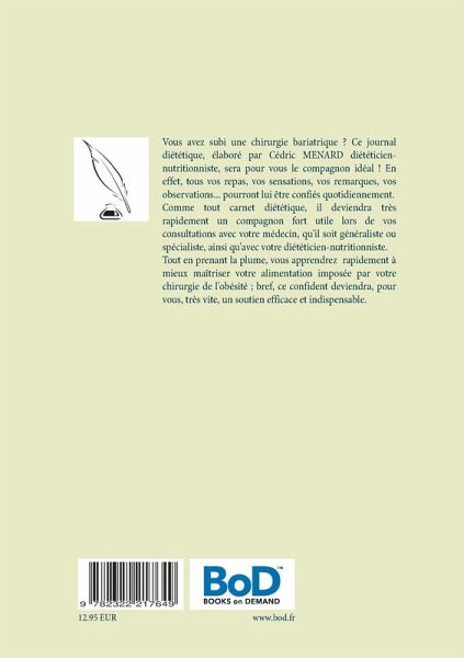 Vous avez subi une chirurgie bariatrique ?Ce journal diététique, élaboré par Cédric MENARD diététicien-nutritionniste, sera pour vous le compagnon idéal !En effet, tous vos repas, vos sensations, vos remarques, vos observations... pourront lui être confiés quotidiennement.Comme tout carnet diététique, il deviendra très rapidement un compagnon fort utile lors de vos consultations avec votre médecin, qu'il soit généraliste ou spécialiste, ainsi qu'avec votre diététicien-nutritionniste.Tout en prenant la plume, vous apprendrez très rapidement à mieux maîtriser votre alimentation imposée par votre chirurgie de l'obésité ; bref, ce confident deviendra, pour vous, très vite, un soutien efficace et indispensable.Cet ouvrage est également disponible avec une couverture cartonnée.