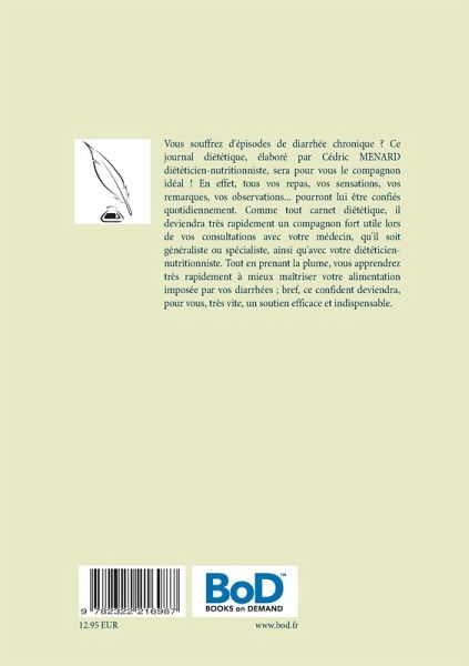 Vous souffrez d'épisodes de diarrhée chronique ?Ce journal diététique, élaboré par Cédric MENARD diététicien-nutritionniste, sera pour vous le compagnon idéal !En effet, tous vos repas, vos sensations, vos remarques, vos observations... pourront lui être confiés quotidiennement.Comme tout carnet diététique, il deviendra très rapidement un compagnon fort utile lors de vos consultations avec votre médecin, qu'il soit généraliste ou spécialiste, ainsi qu'avec votre diététicien-nutritionniste.Tout en prenant la plume, vous apprendrez très rapidement à mieux maîtriser votre alimentation imposée par vos diarrhées ; bref, ce confident deviendra, pour vous, très vite, un soutien efficace et indispensable.Cet ouvrage est également disponible avec une couverture cartonnée.