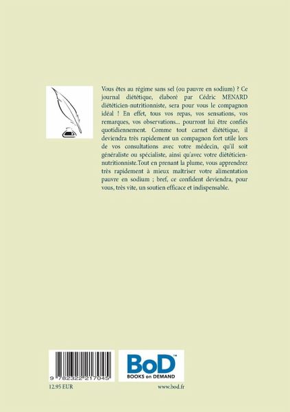 Vous êtes au régime sans sel (ou pauvre en sodium) ?Ce journal diététique, élaboré par Cédric MENARD diététicien-nutritionniste, sera pour vous le compagnon idéal !En effet, tous vos repas, vos sensations, vos remarques, vos observations... pourront lui être confiés quotidiennement.Comme tout carnet diététique, il deviendra très rapidement un compagnon fort utile lors de vos consultations avec votre médecin, qu'il soit généraliste ou spécialiste, ainsi qu'avec votre diététicien-nutritionniste.Tout en prenant la plume, vous apprendrez très rapidement à mieux maîtriser votre alimentation pauvre en sodium ; bref, ce confident deviendra, pour vous, très vite, un soutien efficace et indispensable.Cet ouvrage est également disponible avec une couverture cartonnée.