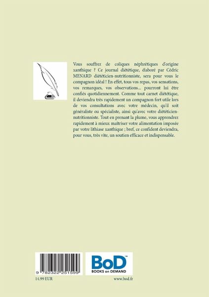 Vous souffrez de coliques néphrétiques d'origine xanthique ?Ce journal diététique, élaboré par Cédric MENARD diététicien-nutritionniste, sera pour vous le compagnon idéal !En effet, tous vos repas, vos sensations, vos remarques, vos observations... pourront lui être confiés quotidiennement.Comme tout carnet diététique, il deviendra très rapidement un compagnon fort utile lors de vos consultations avec votre médecin, qu'il soit généraliste ou spécialiste, ainsi qu'avec votre diététicien-nutritionniste.Tout en prenant la plume, vous apprendrez très rapidement à mieux maîtriser votre alimentation imposée par votre lithiase xanthique ; bref, ce confident deviendra, pour vous, très vite, un soutien efficace et indispensable.Cet ouvrage est également disponible avec une couverture dure.