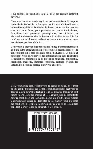 « La réussite est planifiable, sauf la fin et les résultats resteront ouverts. »C´est avec cette citation de Jogi Löw, ancien entraîneur de l´équipe nationale de football de l´Allemagne, suivi dans une interview de la radio d´information, dans le temps appelé B5-Nachrichten, aujourd´hui renominée BR-24, que François ChukwuEmeka s´est vu confirmé dans son ambition de donner des astuces importantes à travers un autre prisme, pour permettre aux jeunes footballeuses, footballeurs et à leurs parents, de comprendre le football moderne. Il le fait à travers les histoires authentiques qu´il a pu vivre au sein des deux associations sportives dont il est membre actif, le FC Unterföhring et la Communauté Sportive de Munich.