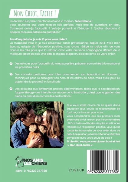 La décision est prise : vous allez devenir l'heureux propriétaire d'un chiot. Félicitations !Vous souhaitez que votre relation soit parfaite, mais vous vous posez encore de nombreuses questions... Comment dois-je l'accueillir ? Vais-je parvenir à l'éduquer ? De quelle manière vais-je gérer les aléas du quotidien ?Pas d'inquiétude, je suis là pour vous aider !Je m'appelle Paul et je suis éducateur canin professionnel depuis 2014. Adepte de l'éducation canine positive, j'ai rédigé ce guide afin de vous donner les clés pour que la relation avec votre nouveau compagnon de vie débute de la meilleure façon qui soit.Cet ouvrage vous permettra d'appréhender parfaitement les premiers mois avec votre chiot :- Vous découvrirez des astuces pour l'accueillir du mieux possible, préparer son premier transport, l'arrivée à la maison et les premières nuits ;- Vous obtiendrez également des conseils pratiques pour bien commencer son éducation : je vous livrerai des techniques pour lui enseigner son nom et les ordres de base en douceur, mais aussi pour l'éduquer à la propreté et à la solitude, des étapes cruciales dans la vie d'un chien !- Enfin, vous serez guidé dans les différentes phases déterminantes, telles que la sociabilisation, l'apprentissage des interdits ou encore les frustrations, ainsi que la gestion des petits tracas quotidiens comme les destructions.Ce livre est destiné à tous les maîtres et les chiens, que vous soyez novice ou en quête d'une éducation plus douce et respectueuse de l'animal.Avec mon aide, vous comprendrez que les premiers mois avec votre chiot ne sont pas insurmontables ! Grâce à des méthodes simples et efficaces fondées sur l'éducation positive, vous aurez toutes les bases pour vous aider dans ce début de relation et ainsi créer une véritable complicité avec votre boule de poils !Et bientôt, vous pourrez clamer haut et fort : " Mon chiot, facile ! "