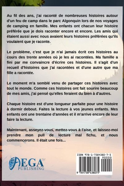 Au fil des ans, j'ai raconté de nombreuses histoires autour d'un feu de camp dans le parc Algonquin lors de nos voyages de camping en famille. Mes enfants ont chacun leur histoire préférée que je dois raconter encore et encore. Les amis qui étaient aussi avec nous avaient leurs histoires préférées qu'ils voulaient que je raconte. Le problème, c'est que je n'ai jamais écrit ces histoires au cours des trente années où je les ai racontées. Ma famille a fini par me convaincre d'écrire ces histoires. Il s'agit d'un recueil d'histoires que j'ai racontées et d'une autre que ma fille a racontée. Le moment m'a semblé venu de partager ces histoires avec tout le monde. Comme ces histoires ont fait sourire beaucoup de mes amis, j'ai pensé qu'elles feraient du bien à d'autres. Chaque histoire est d'une longueur parfaite pour une histoire à dormir debout. Faites la lecture à vos jeunes enfants. Mes enfants ont une trentaine d'années et il m'arrive encore de leur faire la lecture. Maintenant, asseyez-vous, mettez-vous à l'aise, et laissez-moi prendre mon pull de lecture mal fichu, et nous commencerons. Il était une fois...Au fil des ans, j'ai raconté de nombreuses histoires autour d'un feu de camp dans le parc Algonquin lors de nos voyages de camping en famille. Mes enfants ont chacun leur histoire préférée que je dois raconter encore et encore. Les amis qui étaient aussi avec nous avaient leurs histoires préférées qu'ils voulaient que je raconte. Le problème, c'est que je n'ai jamais écrit ces histoires au cours des trente années où je les ai racontées. Ma famille a fini par me convaincre d'écrire ces histoires. Il s'agit d'un recueil d'histoires que j'ai racontées et d'une autre que ma fille a racontée. Le moment m'a semblé venu de partager ces histoires avec tout le monde. Comme ces histoires ont fait sourire beaucoup de mes amis, j'ai pensé qu'elles feraient du bien à d'autres. Chaque histoire est d'une longueur parfaite pour une histoire à dormir debout. Faites la lecture à vos jeunes enfants. Mes enfants ont une trentaine d'années et il m'arrive encore de leur faire la lecture. Maintenant, asseyez-vous, mettez-vous à l'aise, et laissez-moi prendre mon pull de lecture mal fichu, et nous commencerons. Il était une fois...