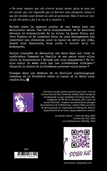 « On pense toujours que cela n'arrive qu'aux autres, qu'on ne peut pas être touché, que c'est impossible que ces horreurs nous atteignent, comme si une fée invisible avait déroulé un voile de protection. Mais il n'en est rien. La fée elle-même a fui à la vue de ce monstre. »Nevada passe la majeure partie de son temps avec ses meilleures amies. Une série d'enlèvements et de meurtres ébranle la tranquillité de la ville. La jeune fille, qui rêve d'amour et de première fois, ne peut étrangement pas contrôler son obsession pour ce tueur en série qui rôde. Quand elle disparaît, tout porte à croire qu'il l'a kidnappée. Suivez l'enquête et découvrez ces deux âmes qui vont se confronter.Comment sa famille et ses amies vont-elles vivre sa disparition ? Nevada est-elle séquestrée ? Va-t-elle subir le même sort que les précédentes victimes ? Jusqu'où la colère et la tristesse peuvent-elles mener ?Plongez dans les dédales de ce thriller psychologique intense, où la frontière entre la haine et le désir peut rendre fou.