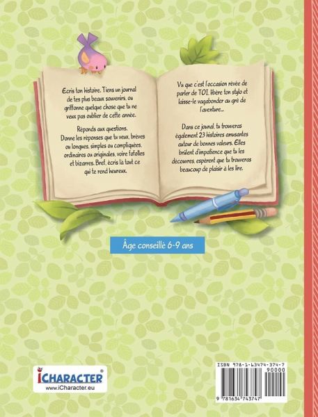 Avec 23 histoires Ecris ton histoire. Tiens un journal de tes plus beaux souvenirs, ou griffonne quelque chose que tu ne veux pas oublier de cette année. Réponds aux questions. Donne les réponses que tu veux, brèves ou longues, simples ou compliquées, ordinaires ou originales, voire fofolles et bizarres. Bref, écris là tout ce qui te rend heureux. Vu que c'est l'occasion révée de parler de TOI, libère ton stylo et laisse-le vagabonder au gré de l'aventure... Dans ce jounal, tu trouveras également 23 histoires amusantes autour de bonnes valeurs. Elles brûlent d'impatience que tu les découvres, espèrent que tu trouveras beaucoup de plaisir à les lire. Âge conseillé 6-9 ans. www.icharacter.eu