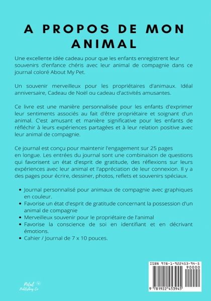 Une excellente idée cadeau pour que les enfants enregistrent leursouvenirs d'enfance chéris avec leur animal de compagnie dans ce journal coloré À propos de mon animal de compagnie. Un souvenir merveilleux pour les propriétaires d'animaux. Idéal anniversaire, Cadeau de Noël ou cadeau d'activités amusantes. Ce livre est une manière personnalisée pour les enfants d'exprimer leur sentiments associés au fait d'être propriétaire et soignant d'un animal. C'est amusant et manière significative pour les enfants de réfléchir à leurs expériences partagées et à leur relation positive avec leur animal de compagnie. Ce journal est conçu pour maintenir l'engagement sur 25 pages en longue. Les entrées du journal sont une combinaison de questions qui favorisent un état d'esprit de gratitude, des réflexions sur leurs expériences avec leur animal et l'appréciation de leur connexion. Il y a des pages pour écrire, dessiner, photos, reflets et souvenirs spéciaux. - Journal personnalisé pour animaux de compagnie avec graphiques en couleur. - Favorise un état d'esprit de gratitude concernant la possession d'un animal de compagnie - Merveilleux souvenir pour le propriétaire de l'animal - Favorise la conscience de soi en identifiant et en décrivant émotions. - Cahier / Journal de 6,69 x 9,61 pouces.