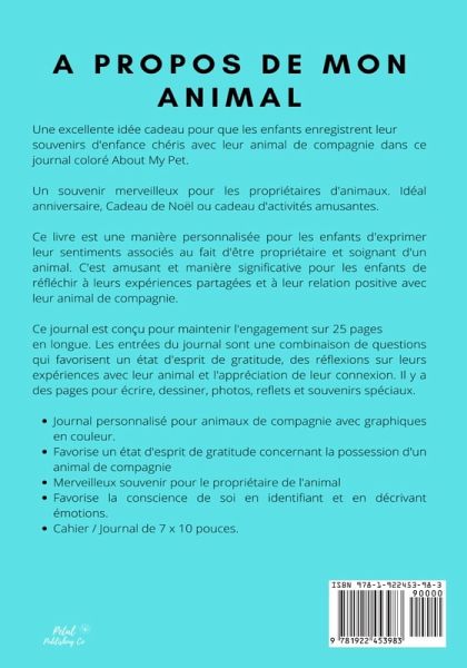 Un souvenir merveilleux pour les propriétaires d'animaux. Idéal anniversaire, Cadeau de Noël ou cadeau Une excellente idée cadeau pour que les enfants enregistrent leur souvenirs. Enregistrer des souvenirs spéciaux avec leur animal de compagnie dans ce journal coloré À propos de mon animal de compagnie.d'activités amusantes. Ce livre est une manière personnalisée pour les enfants d'exprimer leur sentiments associés au fait d'être propriétaire et soignant d'un animal. C'est amusant et manière significative pour les enfants de réfléchir à leurs expériences partagées et à leur relation positive avec leur animal de compagnie. Ce journal est conçu pour maintenir l'engagement sur 25 pages en longue. Les entrées du journal sont une combinaison de questions qui favorisent un état d'esprit de gratitude, des réflexions sur leurs expériences avec leur animal et l'appréciation de leur connexion. Il y a des pages pour écrire, dessiner, photos, reflets et souvenirs spéciaux. - Journal personnalisé pour animaux de compagnie avec graphiques en couleur. - Favorise un état d'esprit de gratitude concernant la possession d'un animal de compagnie - Merveilleux souvenir pour le propriétaire de l'animal - Favorise la conscience de soi en identifiant et en décrivant émotions. - Cahier / Journal de 6,69 x 9,61 pouces.