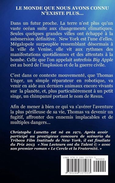 Dans un futur proche. La terre n'est plus qu'un vaste océan suite aux changements climatiques. New York a échappé à la submersion. Mégalopoles surpeuplée vivant aux rythmes des attentats à la bombe, elle est au bord de l'implosion et de la guerre civile. C'est dans ce contexte mouvementé que Thomas Unger, un simple réparateur en robotique, va venir en aide aux derniers animaux encore vivants de la planéte, et plus particulièrement, à un petit singe, un chimpanzé nommé Resus. Afin de mener à bien ce qui va s'avérer l'aventure la plus périlleuse de sa vie, Thomas va devenir un fugitif, affronter des ennemis implacables et de multiples dangers...