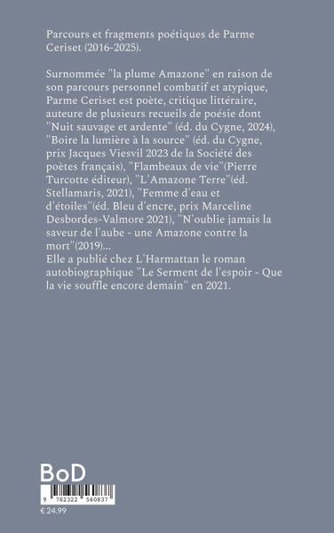 Parcours et fragments poétiques de Parme Ceriset (2016-2025). Surnommée "la plume Amazone" en raison de son parcours personnel combatif et atypique, Parme Ceriset est poète, critique littéraire, auteure de plusieurs recueils de poésie dont "Nuit sauvage et ardente" (éd. du Cygne, 2024), "Boire la lumière à la source" (éd. du Cygne, prix Jacques Viesvil 2023 de la Société des poètes français), "Flambeaux de vie"(Pierre Turcotte éditeur), "L'Amazone Terre"(éd. Stellamaris, 2021), "Femme d'eau et d'étoiles"(éd. Bleu d'encre, prix Marceline Desbordes-Valmore 2021), "N'oublie jamais la saveur de l'aube - une Amazone contre la mort"(2019)... Elle a publié chez L'Harmattan le roman autobiographique "Le Serment de l'espoir - Que la vie souffle encore demain" en 2021.