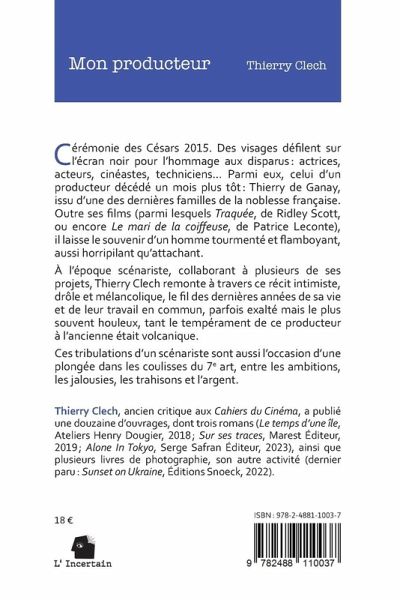 Cérémonie des Césars 2015. Des visages défilent sur l'écran noir pour l'hommage aux disparus: actrices, acteurs, cinéastes, techniciens...Parmi eux, celui d'un producteur décédé un mois plus tôt d'une crise cardiaque: Thierry de Ganay, issu d'une des dernières familles de la noblesse française. Outre ses films (parmi lesquels Traquée de Ridley Scott ou encore le mari de la coiffeuse de Patrice Leconte), il laisse le souvenir d'un homme tourmenté et flamboyant, aussi horripilant qu'attachant. À l'époque scénariste, collaborant à plusieurs de ses projets, Thierry Clech remonte à travers ce récit intimiste, drôle et mélancolique, le fil des dernières années de sa vie et de leur travail en commun, parfois exalté mais le plus souvent houleux, tant le tempérament de ce producteur à l'ancienne était volcanique. Ces tribulations d'un scénariste sont aussi l'occasion d'une plongée dans les coulisses du 7e art, entre les ambitions, les jalousies, les trahisons et l'argent.