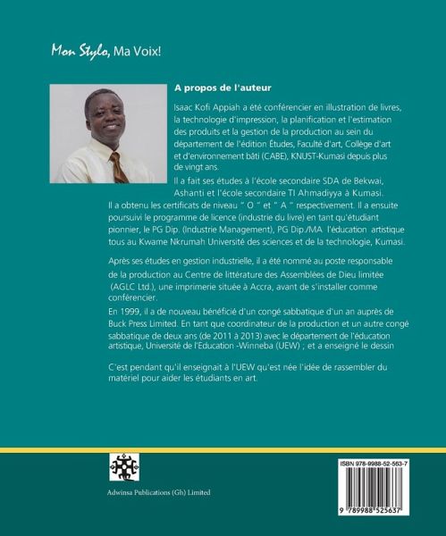 Isaac Kofi Appiah a été conférencier en illustration de livres, la technologie d'impression, la planification et l'estimation des produits et la gestion de la production au sein du département de l'édition Études, Faculté d'art, Collège d'art et d'environnement bâti (CABE), KNUST-Kumasi depuis plus de vingt ans. Il a fait ses études à l'école secondaire SDA de Bekwai, Ashanti et l'école secondaire TI Ahmadiyya à Kumasi Il a obtenu les certificats de niveau " O " et " A " respectivement. Il a ensuite poursuivi le programme de licence (industrie du livre) en tant qu'étudiant pionnier, le PG Dip. (Industrie Management), PG Dip./MA l'éducation artistique tous au Kwame Nkrumah Université des sciences et de la technologie, Kumasi Après ses études en gestion industrielle, il a été nommé au poste responsable de la production au Centre de littérature des Assemblées de Dieu limitée (AGLC Ltd.), une imprimerie située à Accra, avant de s'installer comme conférencier. En 1999, il a de nouveau bénéficié d'un congé sabbatique d'un an auprès de Buck Press Limited. En tant que coordinateur de la production et un autre congé sabbatique de deux ans (de 2011 à 2013) avec le département de l'éducation artistique, Université de l'Education -Winneba (UEW) ; et a enseigné le dessin C'est pendant qu'il enseignait à l'UEW qu'est née l'idée de rassembler du matériel pour aider les étudiants en art. Isaac Kö Appiah has been a lecturer in book illustration, printing technology, product planning and estimation and production management in the Department of Publishing Studies, Faculty of Art, College of Art and Built Environment (CABE), KNUST-Kumasi for over twenty years. He had his education at SDA Secondary School at Bekwai, Ashanti and TI Ahmadiyya Secondary School in Kumasi for the "O" and "A" levels certi¿cates respectively. He subsequently pursued the BA (Book Industry) degree programme as a pioneer student, PG Dip. (Industrial Management), PG Dip./MA (Art Education), all in the Kwame Nkrumah University of Science and Technology, Kumasi. After his studies in Industrial Management, he took up an appointment as the Production Manager at the Assemblies of God Literature Centre Limited (AGLC Ltd.), a printing press in Accra for two years before settling as a lecturer. Again, in 1999 he had a one year Sabbatical leave with Buck Press Limited as a Production Coordinator and another two year Sabbatical leave (from 2011-2013) with the Department of Art Education, University of Education - Winneba (UEW); and taught drawing. It was during his teaching at UEW that the idea to put together material to aid art students was hatched.