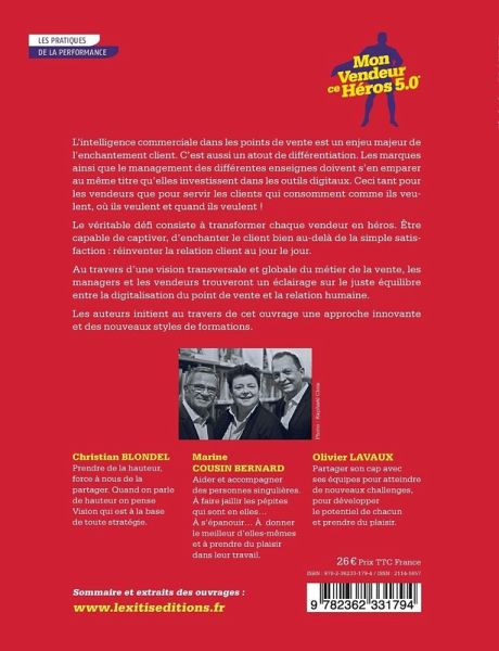 L'intelligence commerciale dans les points de vente est un enjeu majeur de l'enchantement client. C'est aussi un atout de différentiation. Les marques ainsi que le management des différentes enseignes doivent s'en emparer au même titre qu'elles investissent dans les outils digitaux. Ceci tant pour les vendeurs que pour servir les clients qui consomment comme ils veulent, où ils veulent et quand ils veulent ! Le véritable défi consiste à transformer chaque vendeur en héros. Etre capable de captiver, d'enchanter le client bien au-delà de la simple satisfaction : réinventer ma relation client au jour le jour. Au travers d'une vision transversale et globale du métier de la vente, les managers et les vendeurs trouveront un éclairage sur le juste équilibre entre la digitalisation du point de vente et la relation humaine. Les auteurs initient au travers de cet ouvrage une approche innovante et des nouveaux styles de formations.