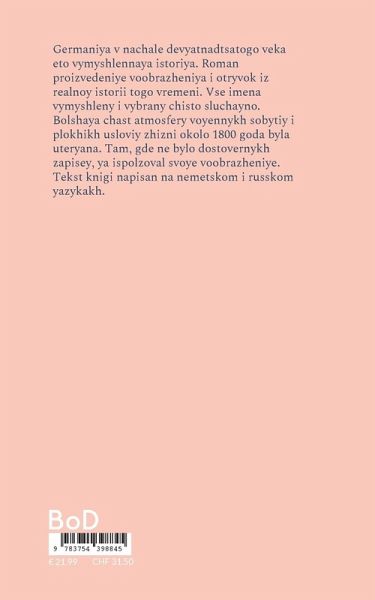 Germaniya v nachale devyatnadtsatogo veka eto vymyshlennaya istoriya. Roman proizvedeniye voobrazheniya i otryvok iz realnoy istorii togo vremeni. Vse imena vymyshleny i vybrany chisto sluchayno. Bolshaya chast atmosfery voyennykh sobytiy i plokhikh usloviy zhizni okolo 1800 goda byla uteryana. Tam, gde ne bylo dostovernykh zapisey, ya ispolzoval svoye voobrazheniye. Tekst knigi napisan na nemetskom i russkom yazykakh.
