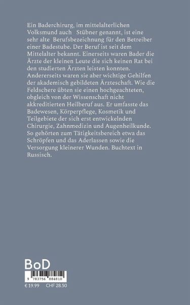 Ein Baderchirurg, im mittelalterlichen Volksmund auch Stübner genannt, ist eine sehr alte Berufsbezeichnung für den Betreiber einer Badestube. Der Beruf ist seit dem Mittelalter bekannt. Einerseits waren Bader die Ärzte der kleinen Leute die sich keinen Rat bei den studierten Ärzten leisten konnten. Andererseits waren sie aber wichtige Gehilfen der akademisch gebildeten Ärzteschaft. Wie die Feldschere übten sie einen hochgeachteten, obgleich von der Wissenschaft nicht akkreditierten Heilberuf aus. Er umfasste das Badewesen, Körperpflege, Kosmetik und Teilgebiete der sich erst entwickelnden Chirurgie, Zahnmedizin und Augenheilkunde. So gehörten zum Tätigkeitsbereich etwa das Schröpfen und das Aderlassen sowie die Versorgung kleinerer Wunden. Buchtext in Russisch.