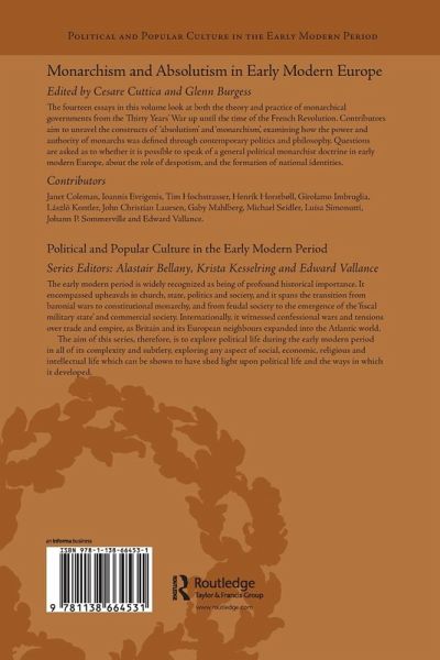The 14 essays in this volume look at both the theory and practice of monarchical governments from the Thirty Years War up until the time of the French Revolution. Contributors aim to unravel the constructs of 'absolutism' and 'monarchism', examining how the power and authority of monarchs was defined through contemporary politics and philosophy.