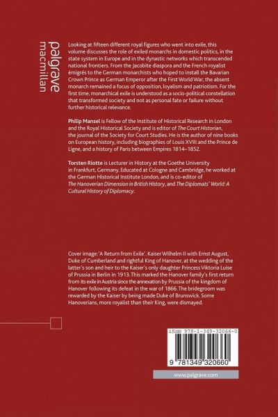 List of Illustrations Notes on Contributors Introduction: Monarchical Exile; P.Mansel & T.Riotte PART I: VARIETIES OF EXILE A Queen Mother in Exile; T.Osborne Gender, Exile and The Hague Courts of Elizabeth, Queen of Bohemia and Mary, Princess of Orange; A.Hughes A Life in Exile; W.O'Reilly Emigrated or Exiled?; F.Tóth PART II: THE STUART CASE 'The Shadow of a King?'; A.Keay Exile or Homecoming?; K.Britland Monarchy and Exile; J.Cronin The Extended Exile of James III; E.Corp PART III: FRENCH EXILES From Exile to the Throne; P.Mansel Napoleon on Elba; P.Hicks The Politics of Waiting; H.Mehrkens PART IV: NATION-BUILDING The Bourbons of Naples in Exile; G.Stair Sainty 'To My Loyal Saxons!'; J.Retallack Hanoverian Exile and Prussian Governance; T.Riotte Epilogue: Kaiser Wilhelm II 'The Unicorn in winter'; J.C.G.Röhl Index