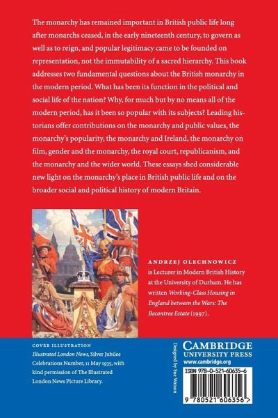 The monarchy has remained important in British public life long after monarchs ceased, in the early nineteenth century, to govern as well as to reign, and popular legitimacy came to be founded on representation, not the immutability of a sacred hierarchy. This book addresses two fundamental questions about the British monarchy in the modern period. What has been its function in the political and social life of the nation? Why, for much but by no means all of the modern period, has it been so popular with its subjects? Leading historians offer contributions on the monarchy and public values, the monarchy's popularity, the monarchy and Ireland, the monarchy on film, gender and the monarchy, the royal court, republicanism, and the monarchy and the wider world. These essays shed considerable new light on the monarchy's place in British public life and on the broader social and political history of modern Britain.