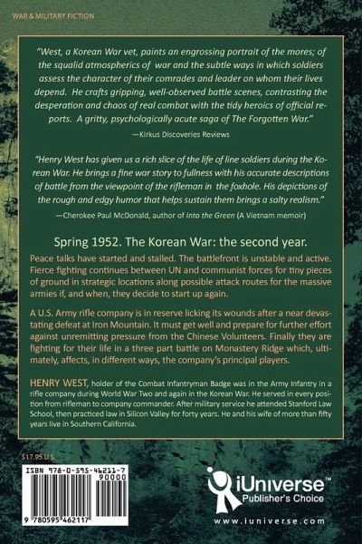 Spring 1952. The Korean War: the second year. Peace talks have started and stalled. The battlefront is unstable and active. Fierce fighting continues between UN and communist forces for tiny pieces of ground in strategic locations along possible attack routes for the massive armies if, and when, they decide to start up again. A U.S. Army rifle company is in reserve licking its wounds after a near-devastating defeat at Iron Mountain. It must get well and prepare for further effort against unremitting pressure from the Chinese Volunteers. Even in this recovery mode there is some down time available, during which the occasionally profound, often lunatic, aspects of infantry life spark up and are played out. A five-day rest period in Japan for the only two officers of the company scores some pleasant relaxation on the shores of Lake Hakone. But it also ends up in a murder in a Tokyo alley. The following army investigation leads back to Korea where the company is fighting for its life in a three part battle on Monastery Ridge which ultimately affects, in different ways, the company's principal players.