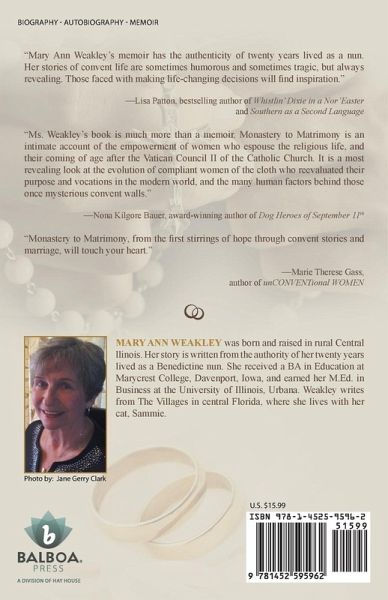 "Mary Ann Weakley's memoir has the authenticity of twenty years lived as a nun. Her stories of convent life are sometimes humorous and sometimes tragic, but always revealing. Those faced with making life-changing decisions will find inspiration." - Lisa Patton, bestselling author of Whistlin' Dixie in a Nor'Easter and Southern as a Second Language "Ms. Weakley's book is much more than a memoir. Monastery to Matrimony is an intimate account of the empowerment of women who espouse the religious life, and their coming of age after the Vatican Council II of the Catholic Church. It is a most revealing look at the evolution of compliant women of the cloth who reevaluated their purpose and vocations in the modern world, and the many human factors behind those once mysterious convent walls." - Nona Kilgore Bauer, award-winning author of Dog Heroes of September 11th "Monastery to Matrimony, from the first stirrings of hope through convent stories and marriage, will touch your heart." - Marie Therese Gass, author of unCONVENTional WOMEN